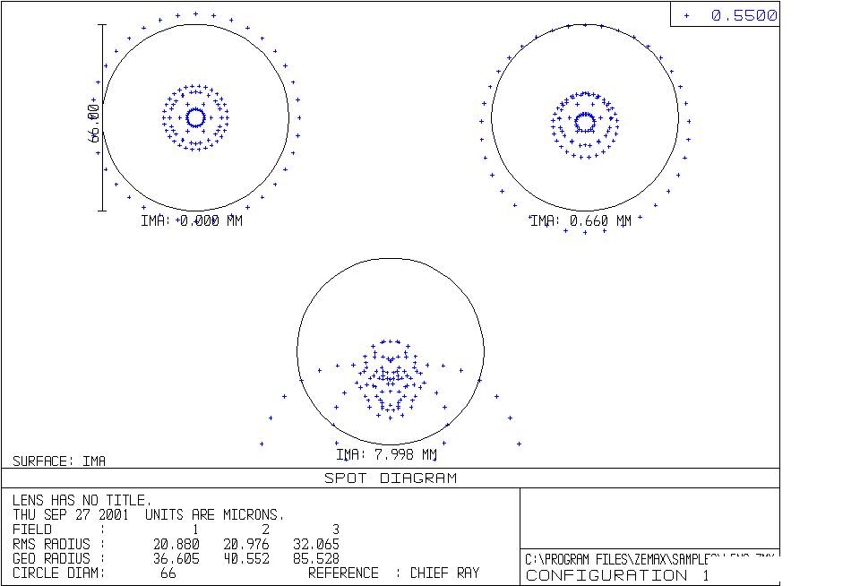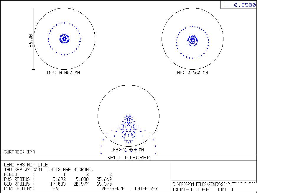 最良スポットダイアグラムを示す。フォーカシングは副鏡を前後させる